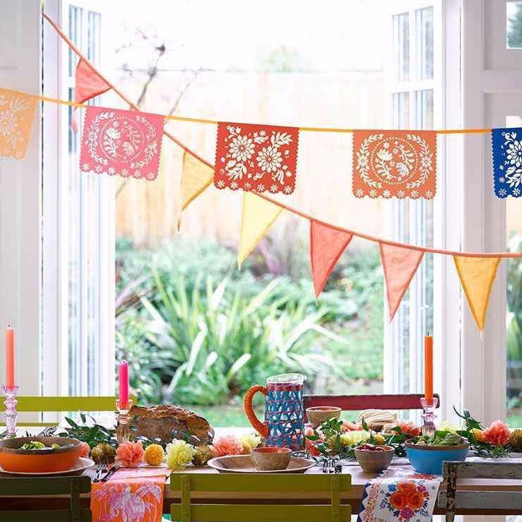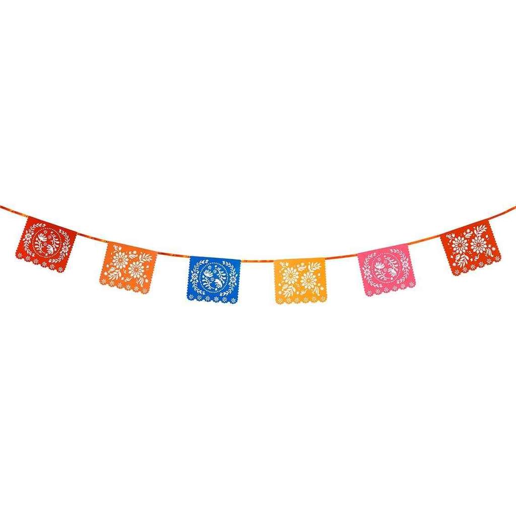 Medida: 4 metros. banderines de papel en colores vivos con dibujos troquelados.