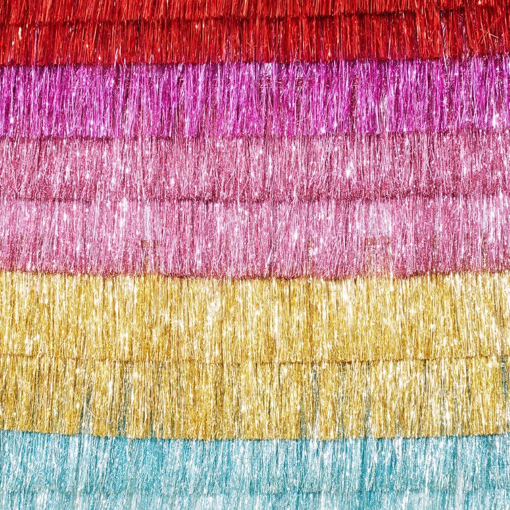 Espectacular guirnalda de flecos en color rosa brillante en dos capas para decorar las fiestas mas elegantes y divertidas. Conseguirás un acabado Chic y mucho brillo con muy poco.