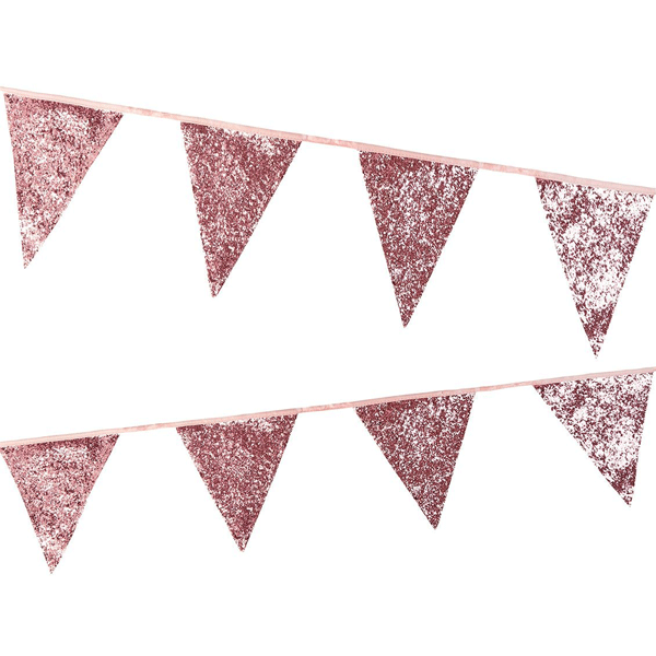 Guirnalda de banderines dorados de glitter rosa dorado ideal para una fiesta de lo más chic y elegante. Su tamaño la hacen perfecta para decorar la pared. Además es fácil de colocar y una vez haya acabado la fiesta la puedes guardar y reutilizar.