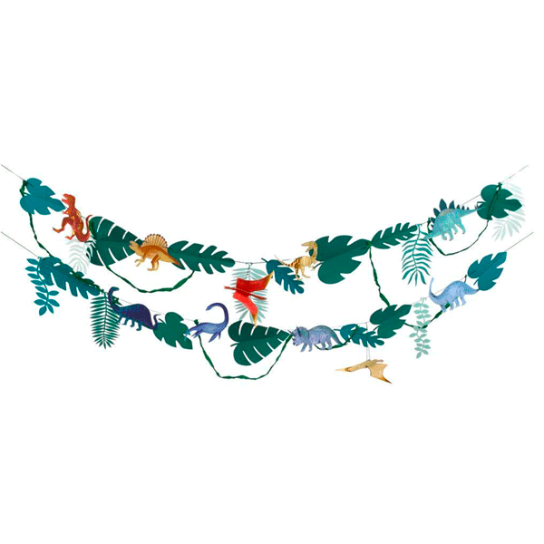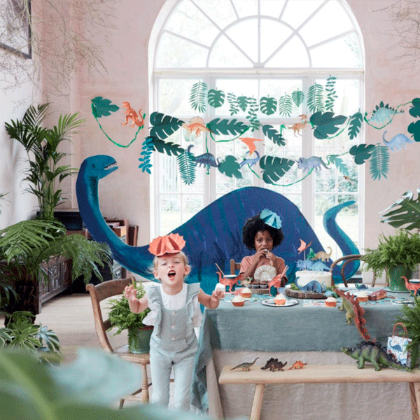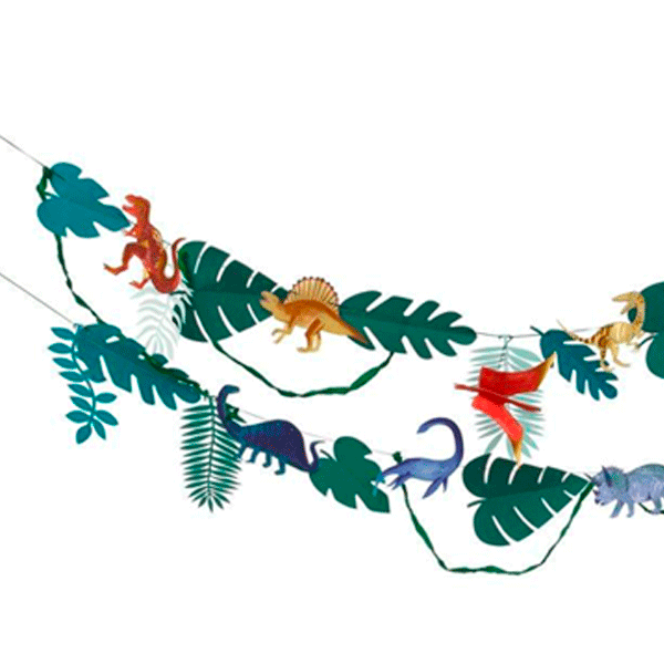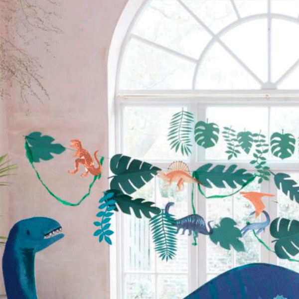 Esta guirnalda tan salvaje repleta con ilustraciones de dinosaurios un poco vintage de colores brillantes y hojas tipo selva, son perfectos para una fiesta jurásica con un aire totalmente diferente. Sofisticada y elegante y gracias a su tamaño podrás decorar el espacio con muy poco.