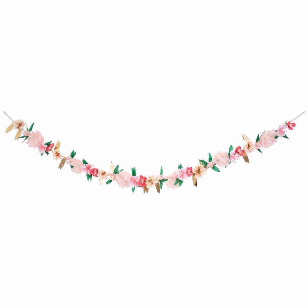 Esta guirnalda de flores de papel de seda en tonos rosas y melocotones y detalles en dorado y verde es espectacular.