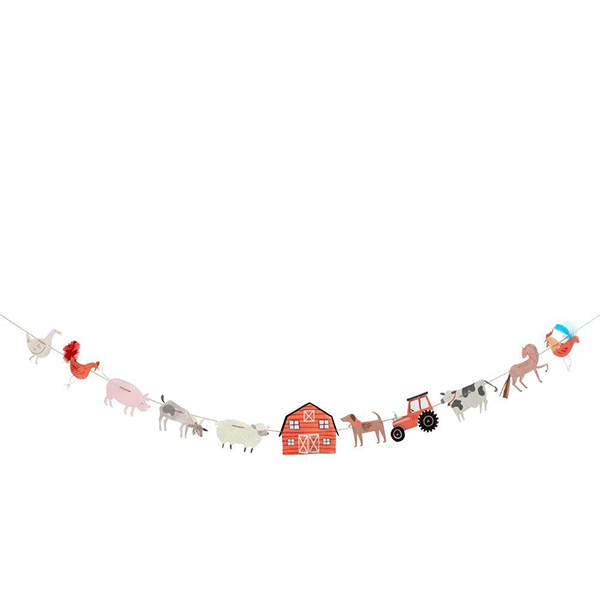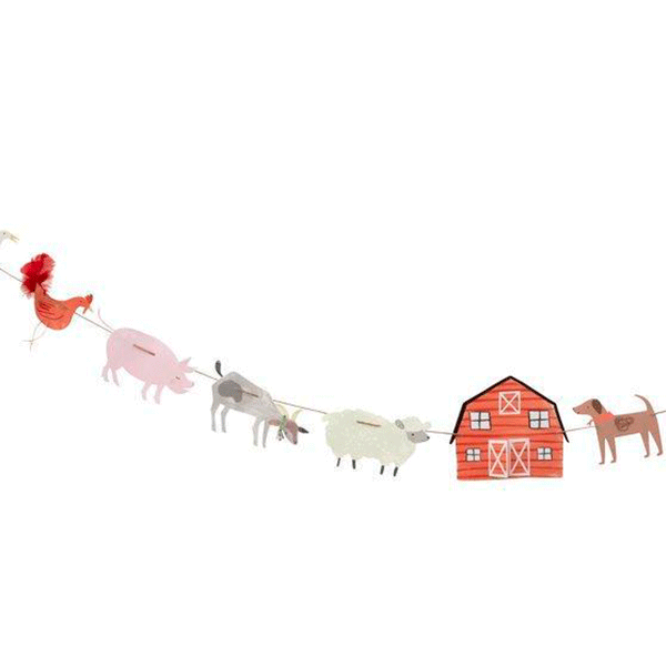 El granero, tractor, las vacas...¡no falta nadie! Guirnalda con ilustraciones de elementos de la granja, ideal para decorar tu mesa dulce o la entrada a la tu fiesta. Puedes combinarlo con detalles básicos para darle mayor protagonismo.