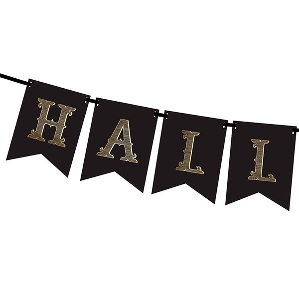 Elegantes guirnalda en banderín negro y letras doradas con la palabra Halloween. Ideal para decorar y dar la bienvenida a la fiesta más terrorífica del año.
