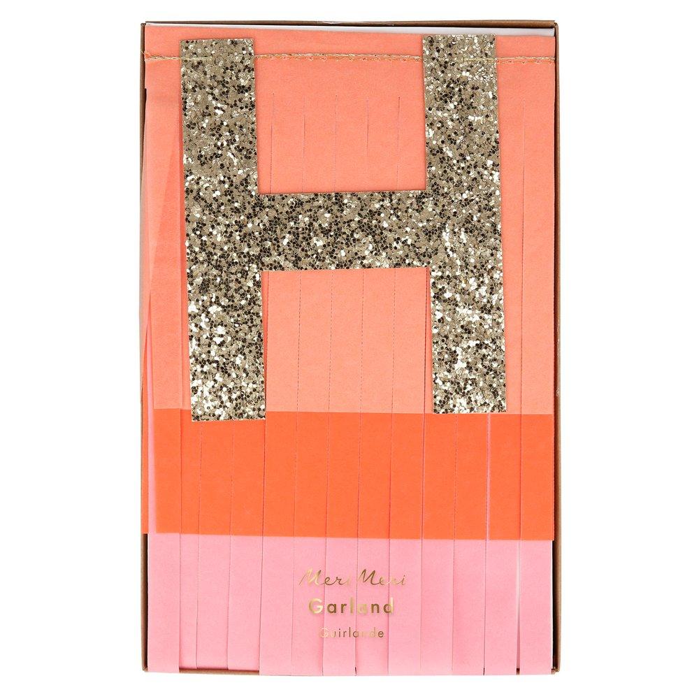 Esta guirnalda de flecos en colores rosa, melocotón y coral junto a un gran happy birthday en dorado brillo es perfecta para cualquier fiesta. La guirnalda viene dividida en dos para que su colocación sea más fácil.