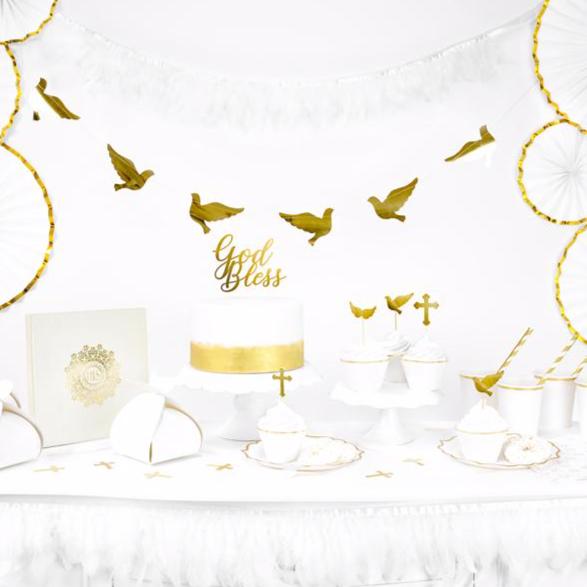 Esta guirnalda es ideal para decorar una mesa dulce de Primera Comunión. En acabado dorado foil y con unas bonitas palomas.