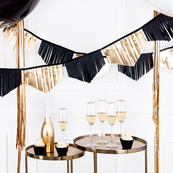 Una guirnalda de banderines en dorado y negro es un básico que siempre queda bien en cualquier fiesta y si además le sumamos que es de flecos tassel, ¡es lo más!