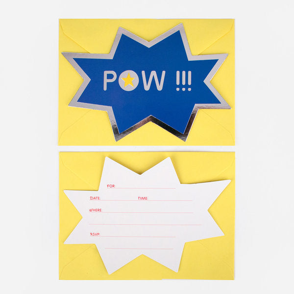 Invitaciones impresas para una fiesta de superhéroes de colores ideales con interior blanco para que escribas y entregues a tus invitados a tu fiesta de cumpleaños.