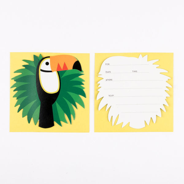 Invitaciones impresas para una fiesta tropical de colores ideales con interior blanco para que escribas y entregues a tus invitados a tu fiesta de cumpleaños.