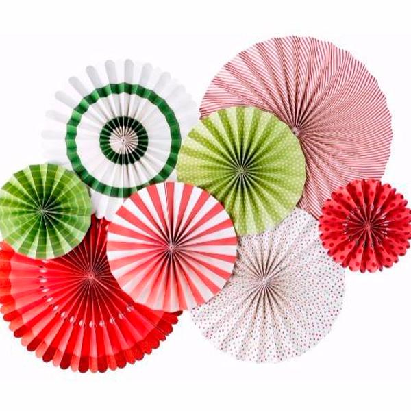 Con este Kit de abanicos de papel y cartón de colores rojo, verde y blanco. Tendrás la decoración de tu fiesta de Navidad o trasera de Candy Bar solucionada. La combinación de motivos, colores y calidades no puede ser más bonita.
