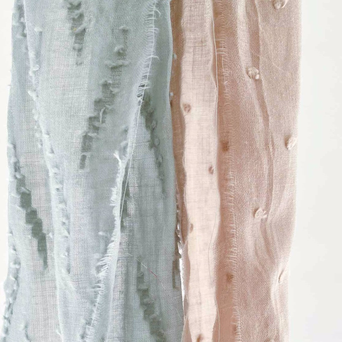 1 Decoración con retales de cintas de tela PLUMETI mint y piedra. Las cintas de un globo L miden 50 cm. de largo y este kit contempla 4 cintas colgando. El tamaño y cantidad de las cintas está calculado para resistir el peso de un globo hinchado con helio