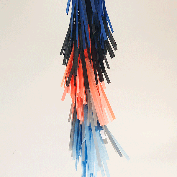 1 Guirnalda de flecos SPACE en papel de seda cosida a mano a una cinta de tela para que puedas cogerla tu globo de forma fácil y rápida. Medidas 70 x 25 cm. Colores: azul marino, celeste, plata y naranja neon.