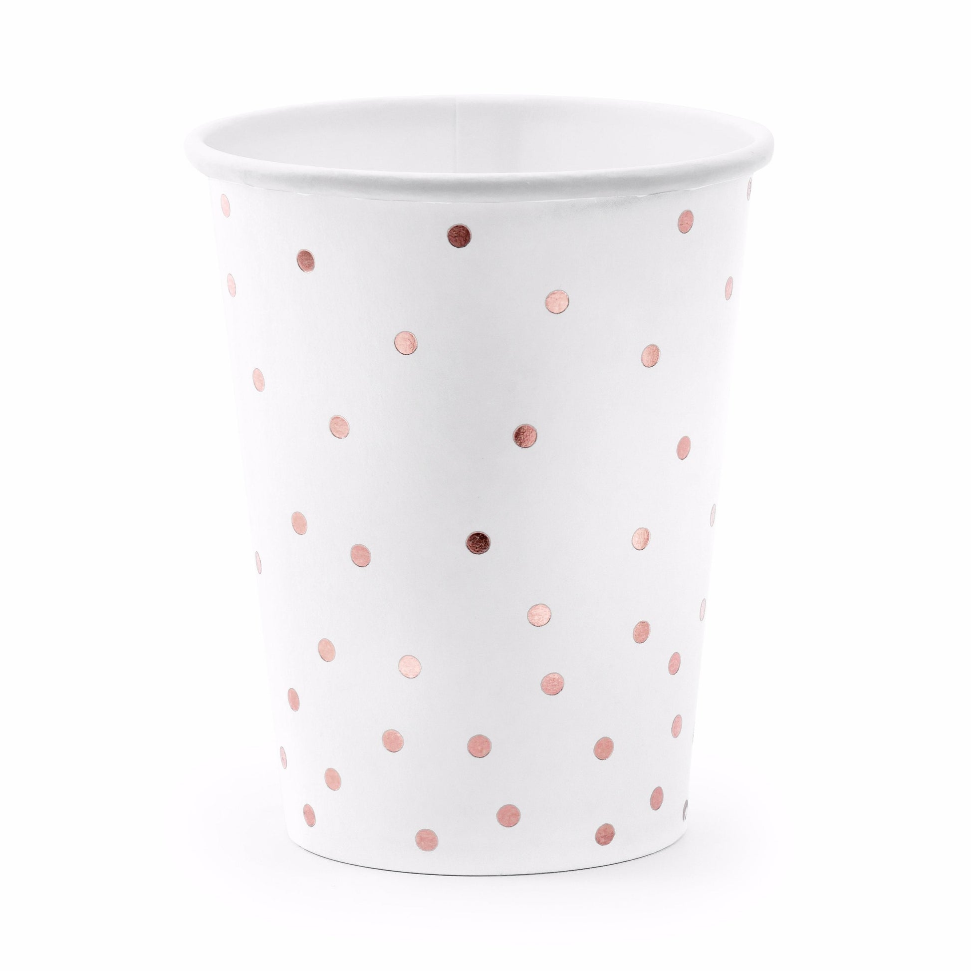 Vasos de cartón resistente en color blanco con topo en acabado rose gold brillante.