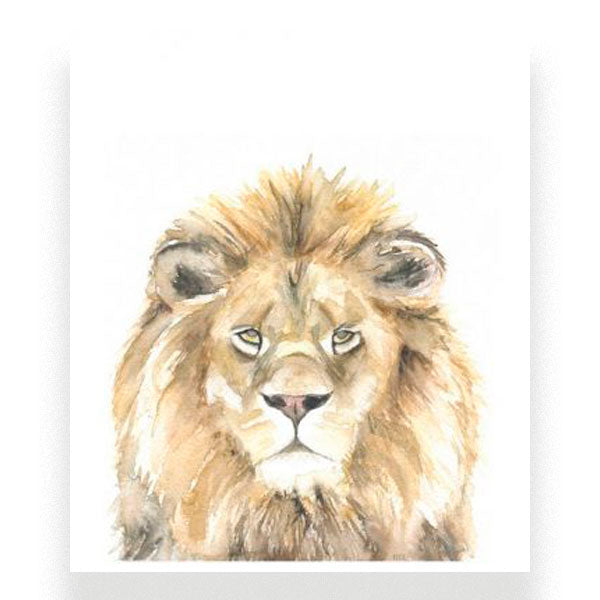 Estos animales decorarán tu fiesta, una habitación o te harán quedar como reina si lo que buscas es un regalo perfecto. Lámina con ilustración de un león ideal realizada en acuarela por la artista chilena María José Abogavir.