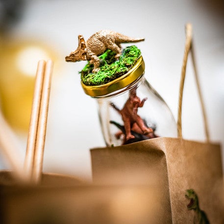 Mini dinosaurios de plástico en color dorado ideal para decorar botecitos de golosina para tus invitados o para complementar tus centro de mesa o decoraciones con temática jurásica o incluso dentro de tu piñata.