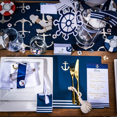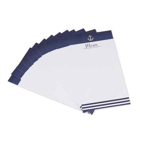 Elegantes minutas con detalles marineros en color azul marino y detalle de ancla en color dorado foil. Son perfectas para escribir el menú para cada invitado a la celebración. Ideales para una Primera Comunión o fiesta con temática de mar.
