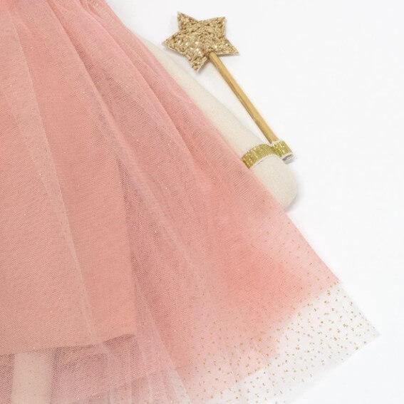 Ella está vestida con un vestido de tul rosa y con unas alas, corona y varita de glitter doradas mágicas.