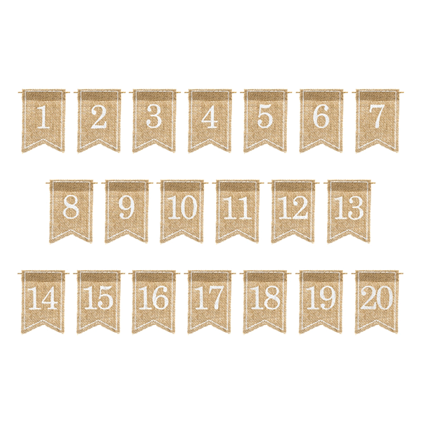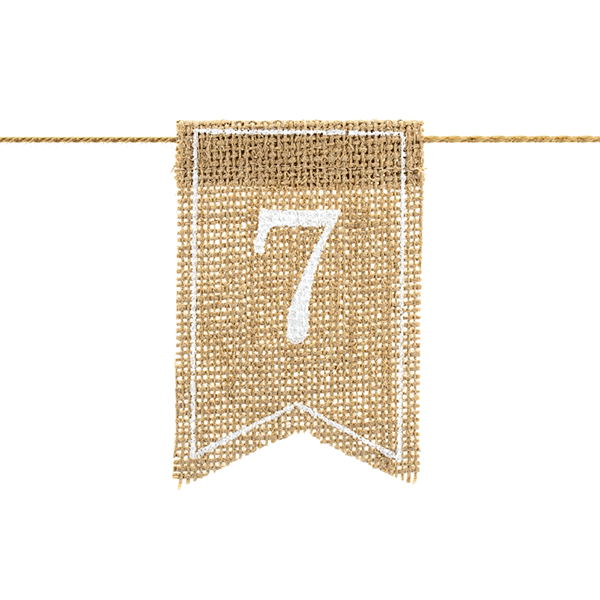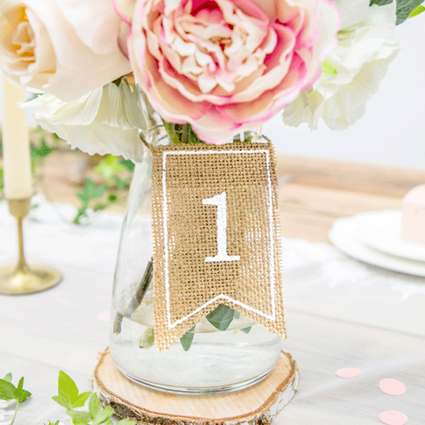 Marcadores de mesa de banderines en yute con lazada ideales para dar un toque rústico a las mesas en tu fiesta o boda.