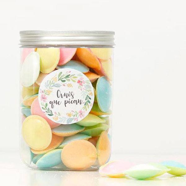 Espectacular bote de plástico grueso brillo con tapa de aluminio repleto de nubes y golosinas multicolor. Ideal para regalar o colocar directamente en tu Candy Bar. Todos nuestros botes incluyen una etiqueta diseñada por La Fiesta de Olivia con el contenido del interior.