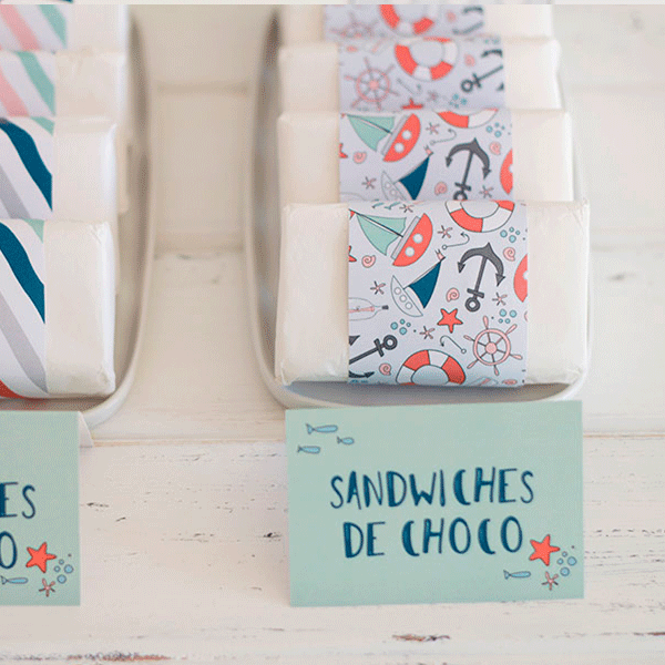 - Fajas de papel estampado para decorar sandwiches, servilleteros o tarros de chuches (2 modelos)
