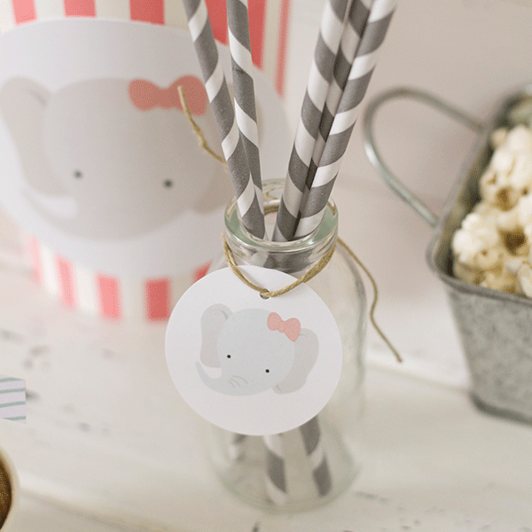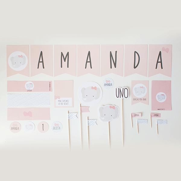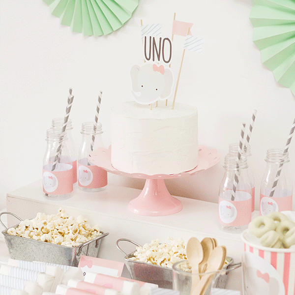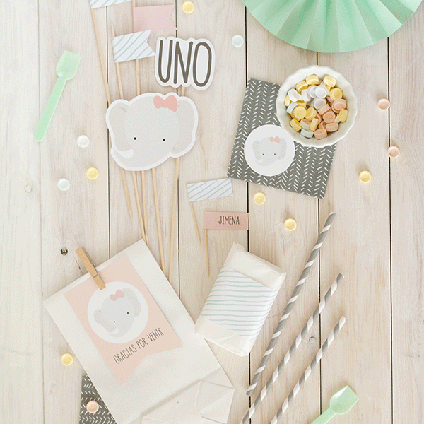 Esta pequeña elefanta con lazo en la cabeza celebrará de una forma muy delicada el cumpleaños de tu pequeña. Queda preciosa combinada con gris y/o mint.