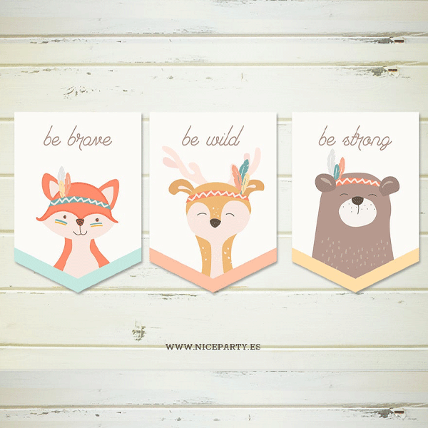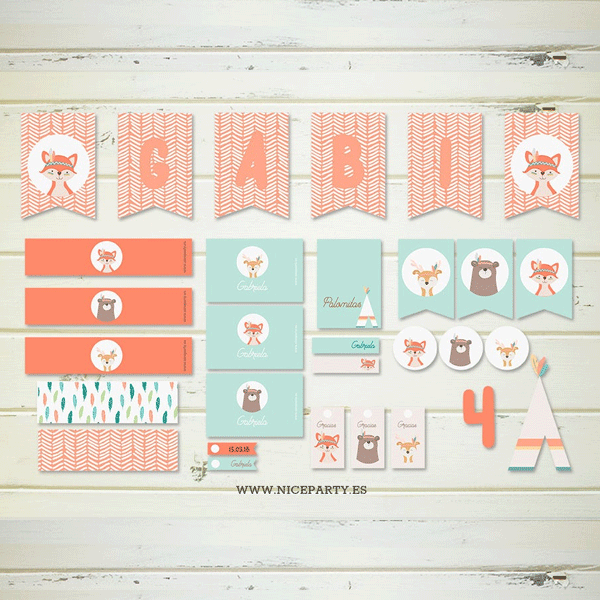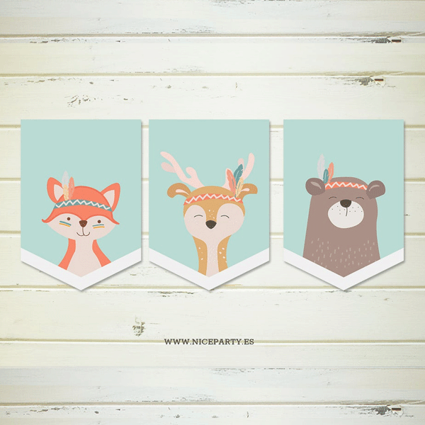 Animalitos celebrando una fiesta de indios con plumas y tipis ¡Es una temática genial! Colores llamativos y animalitos lindos para celebrar las fiestas de cumpleaños de los más pequeños