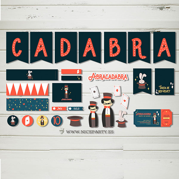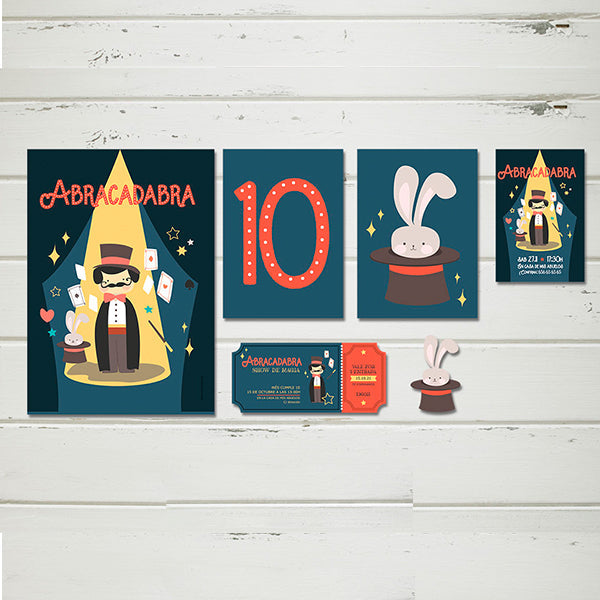 ¡Abracadabra! Una varita y unas palabras mágicas para hacer de esta fiesta todo un espectáculo. Un mago con un gran bigote y su amigo el conejito saliendo de la chistera. Un kit muy combinable para montar una fiesta de magia en casa.