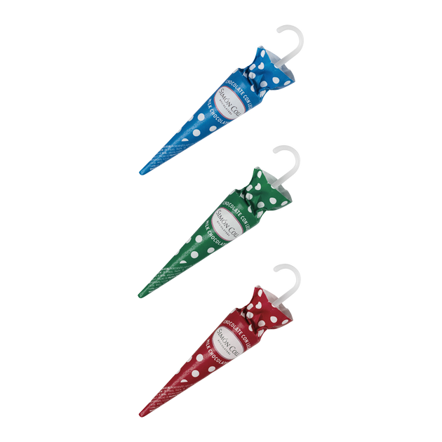 Paraguas de chocolate con leche en varios colores con topos. Están hechos con un 32% de cacao y elaborados a través de nuestro sistema tradicional de tostado del cacao en grano. Sin gluten, elaborado con ingredientes naturales y sin aditivos artificiales. Ideal para colgar como decoración en el árbol de navidad y para que todos los miembros de la familia lo disfruten.