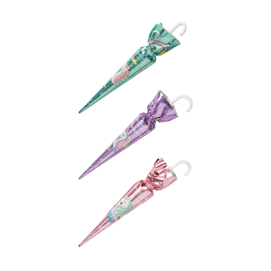 Paraguas de chocolate con leche en varios colores pastel metalizado ilustraciones de unicornio. Están hechos con un 32% de cacao y elaborados a través de nuestro sistema tradicional de tostado del cacao en grano. Sin gluten, elaborado con ingredientes naturales y sin aditivos artificiales.