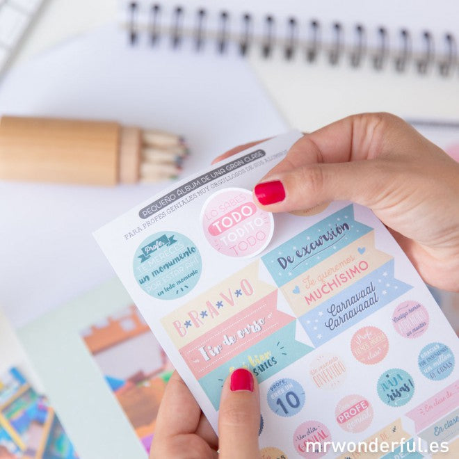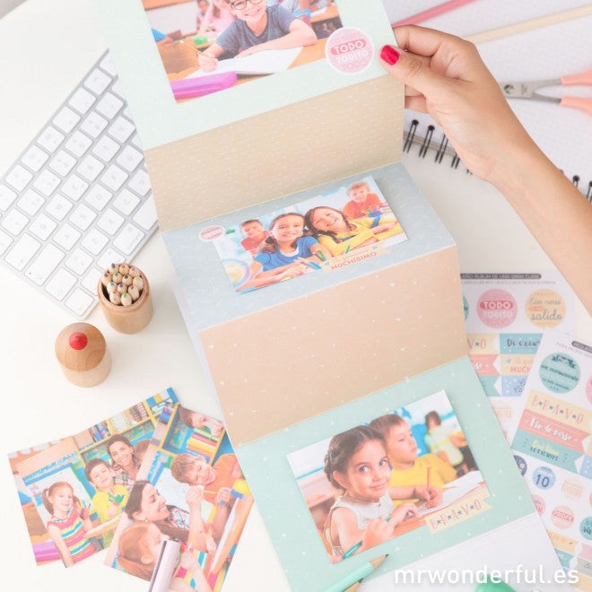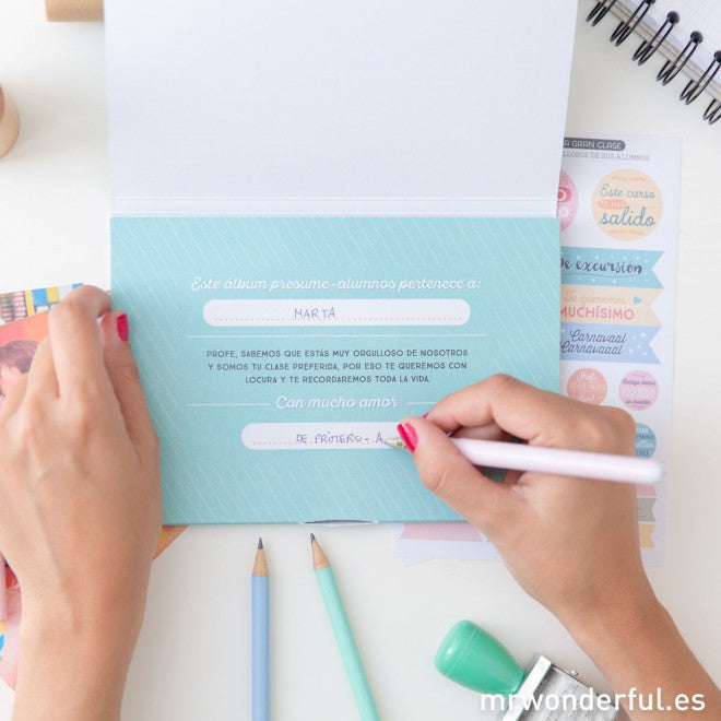 Un álbum de fotos para el mejor profe del mundo mundial, porque ha sido lo más de lo más durante todo el curso y nos ha enseñado un montón de cosas. Nada mejor que agradecérselo con este bonito recuerdo y las fotos más memorables de su clase favorita. Así seguro que vuestro profe nunca se olvidará de vosotros y podrá presumir orgulloso por todo el colegio de sus alumnos.