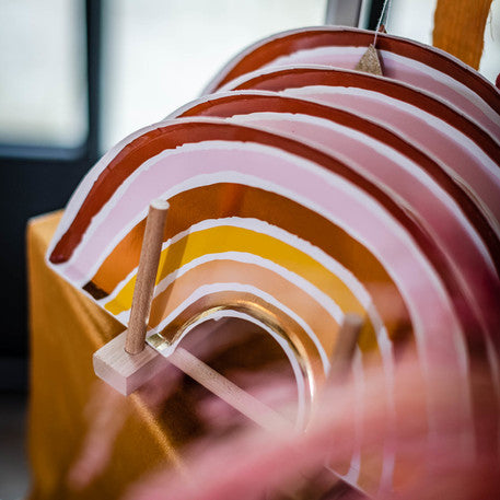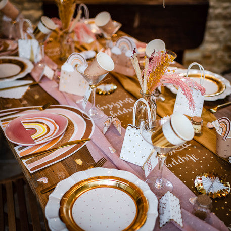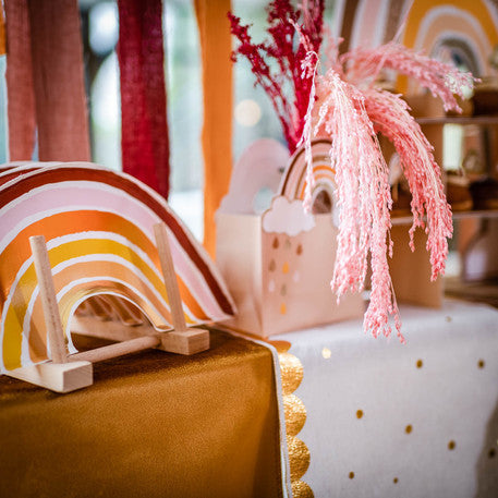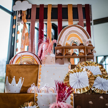 Platos de cartón  con forma de arcoíris en tonos tierras, ocres y dorados. Perfectos para una fiesta de cumpleaños con toques Boho y tonalidades fuera de los clásico. ¡Nos encantan!