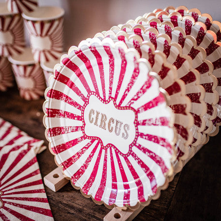 Platos con temática circo de rayas rojas y blancas con un elegante borde de galleta en color dorado. Además tiene un gran Circus en el centro, que le da un aire muy Vintage. Sin duda una vajilla perfecta para fiestas con temática del circo tanto para grandes como pequeños.