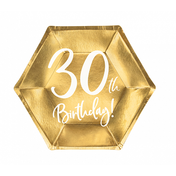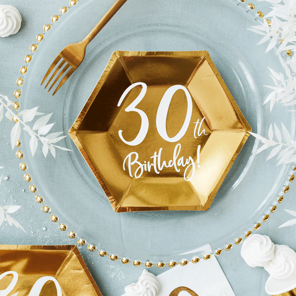 Platos tamaño postre en dorado brillante y mensaje de ¡30 th Birthday! para celebrar por todo lo alto. Son perfectos para servir tu pastel o aperitivo en tu fiesta más especial.