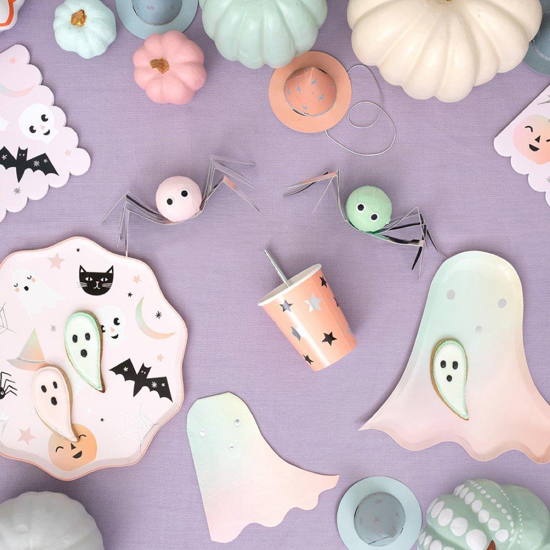 Platos en forma de fantasma en colores pastel con degradado y con detalles en color plateado. Conseguirás un toque brillante y muy fantasmagórico para una mesa de Halloween perfecta.