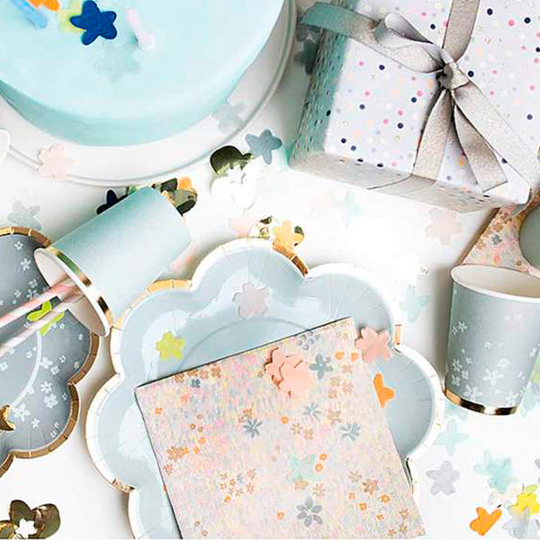 Platos con borde festonado en color dorado brillo con fondo celeste empolvado.