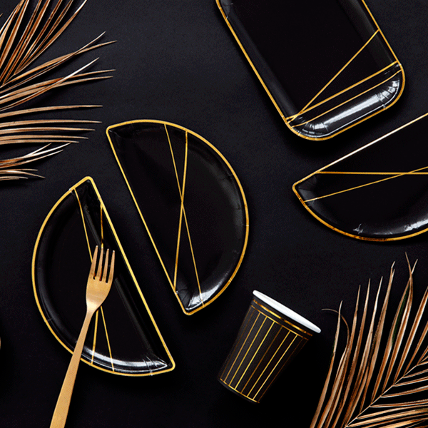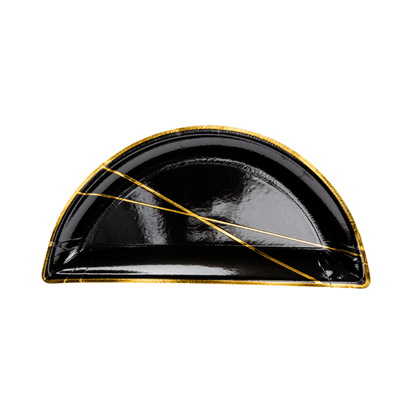 Elegantes platos semicirculares en color negro con bordes en dorado brillo muy Chics para una celebración de lo más elegante.