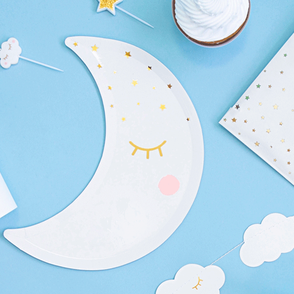 Platos de cartón con forma de luna blanca con detalles brillo Foil dorado con carita muy dulce para fiestas de primer año.