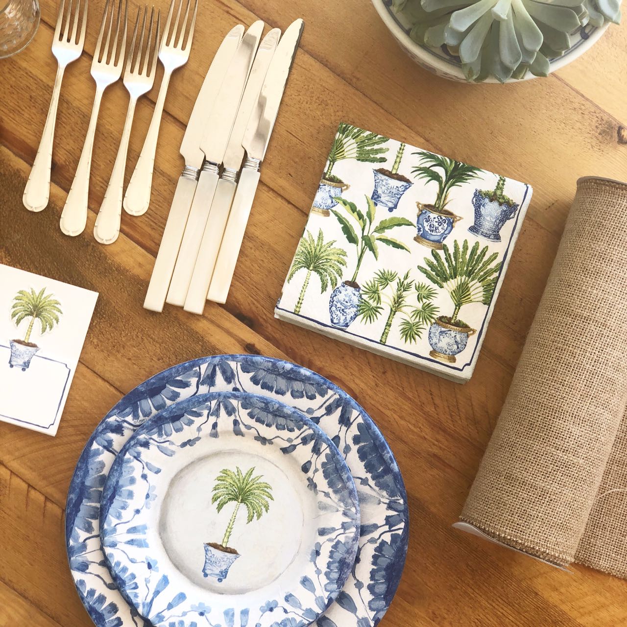 La colección Potted Palms es una de las más elegantes colecciones de fiesta de La Fiesta de Olivia. Sus elegantes motivos de palmeras con tiestos en un color azul vintage son ideales para cenas de verano muy elegantes.