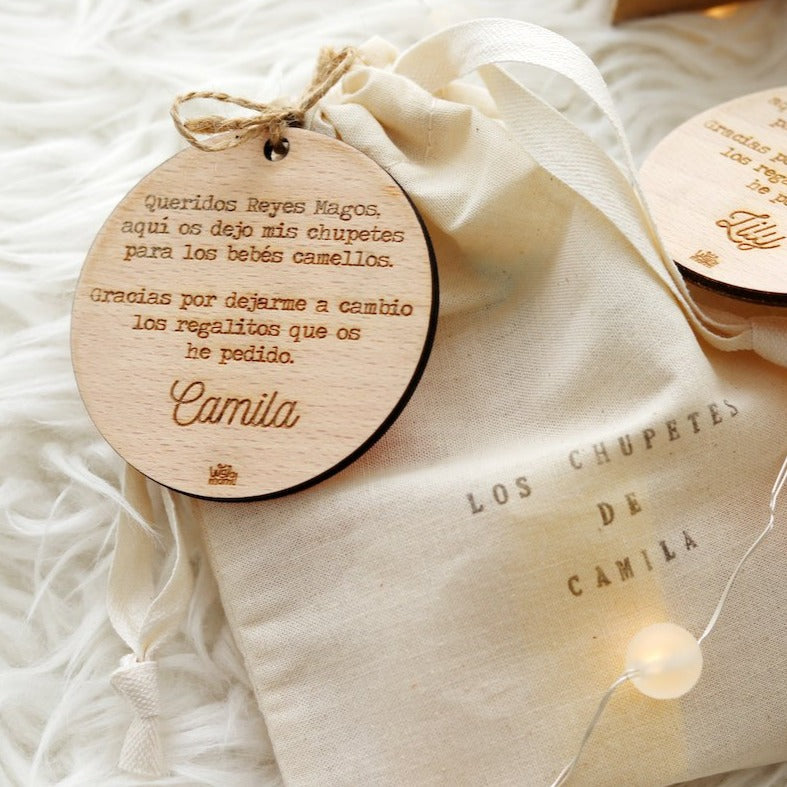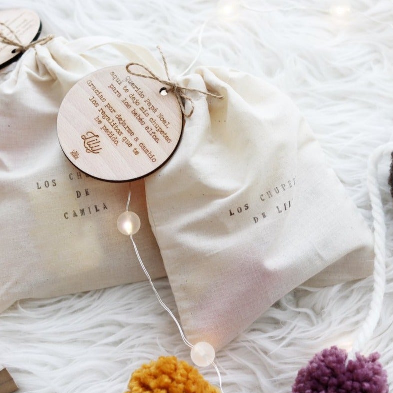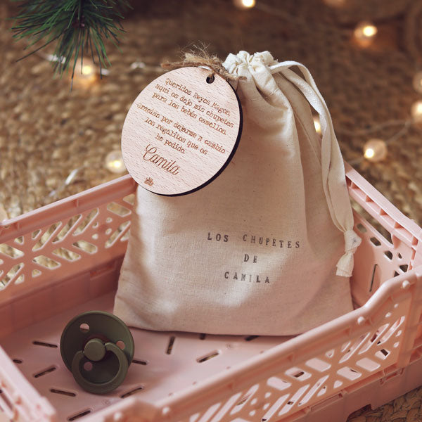 ¿Estáis en esa etapa con vuestro peque en la que deseáis que deje de utilizar chupete? ¡Tenemos la solución! En esta bolsita personalizada los peques podrán dejar todos sus chupetes a Papá Noel o los Reyes Magos para que les dejen a cambio los regalitos que han pedido. ¡Y adiós chupete!