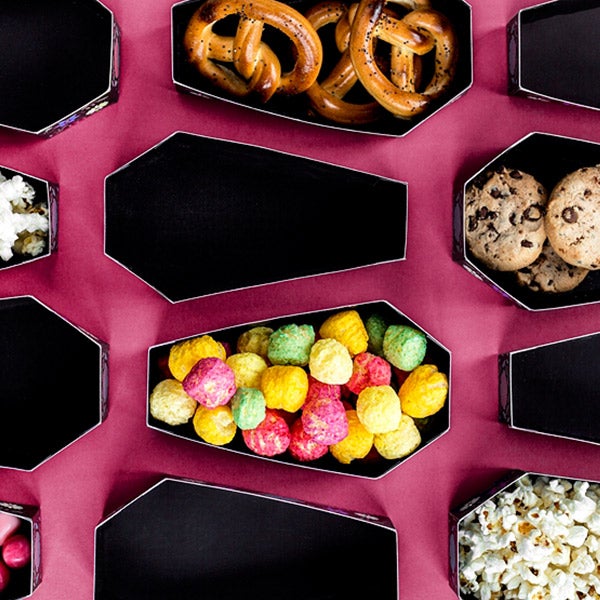 Flores y calaveras para una fiesta Halloween muy chic y divertida. Recipiente de cartón rígido en forma de ataúd con flores ideal para poner en el centro de la mesa.