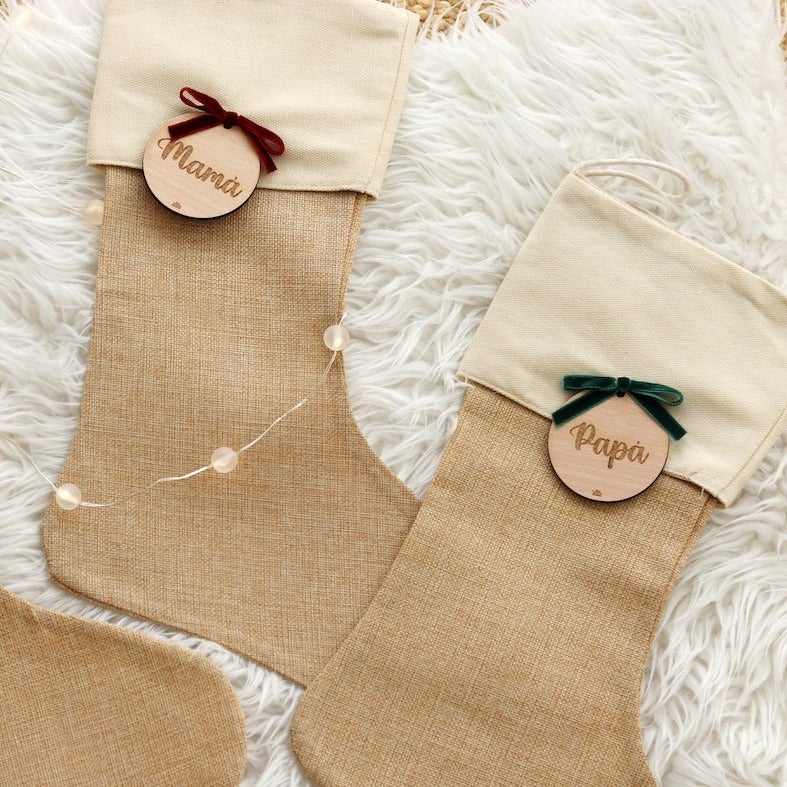 Una bota es un imprescindible en cada Navidad. Estas botas son de tela y están decoradas con una placa de madera con el nombre de cada integrante de la familia.