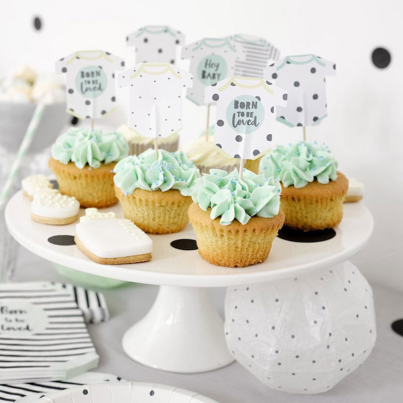 Servilletas en forma de body de rayas con mensaje Born to be Loved ideal para un Baby Shower.