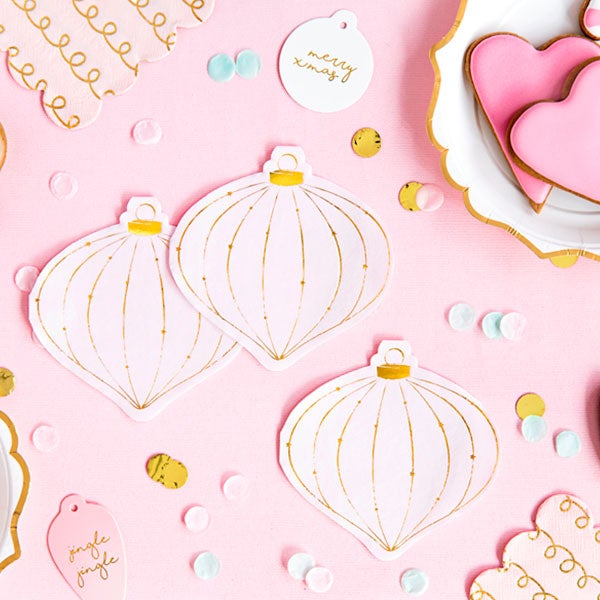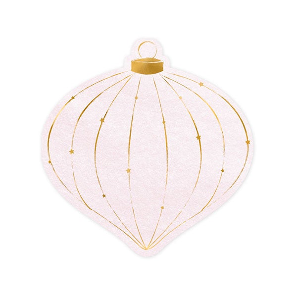 20 uds. de servilletas triple capa con forma de bola de navidad en fondo rosa y resaltes en color dorado mate con estrellas. Con estas servilletas, seguro montarás una mesa muy elegante y original para esta Navidad.