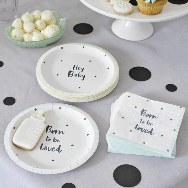 Ideales platos blanco con ribete en amarillo y mint. Los topitos en negro y el texto los hace muy elegantes y sencillos para un fiesta de Baby Shower o de revelación del sexo del bebé.