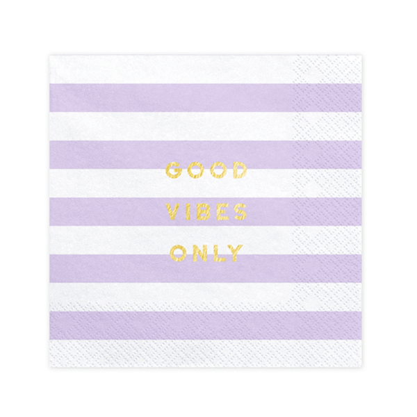 Preciosas servilletas de papel en rayas lila con mensaje en dorado foil " Always be positive"