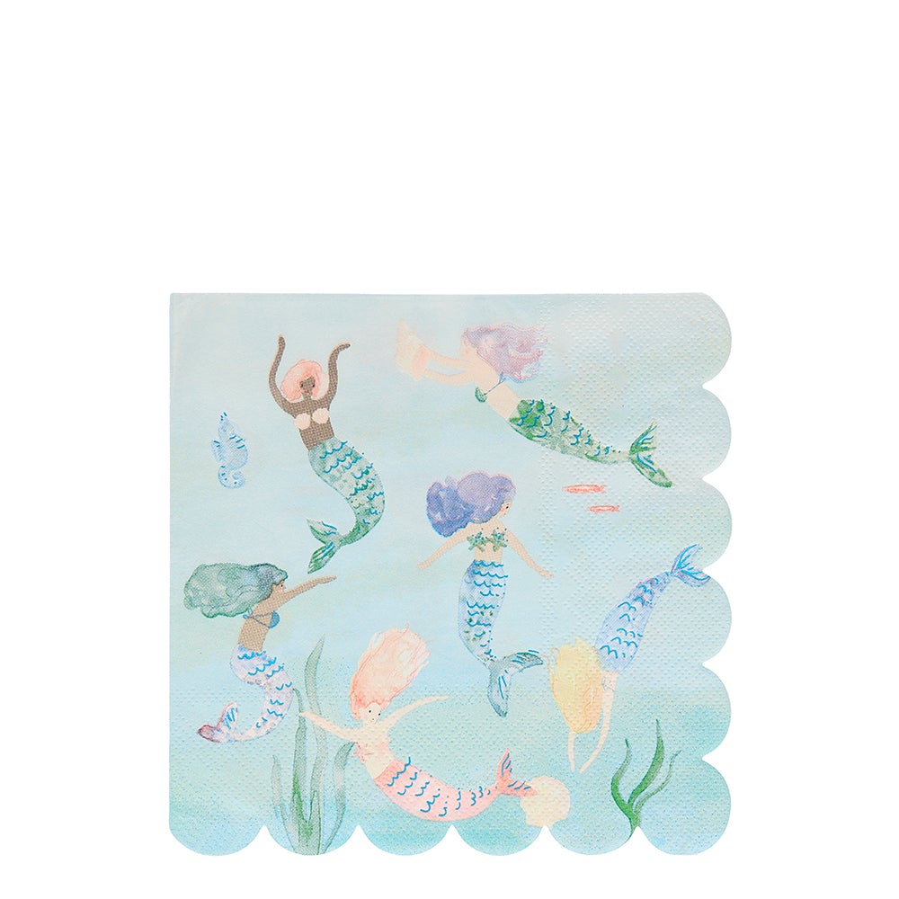 Servilletas con borde tipo galleta e ilustraciones de sirenas pintadas en acuarela. Ideales para fiestas en verano.