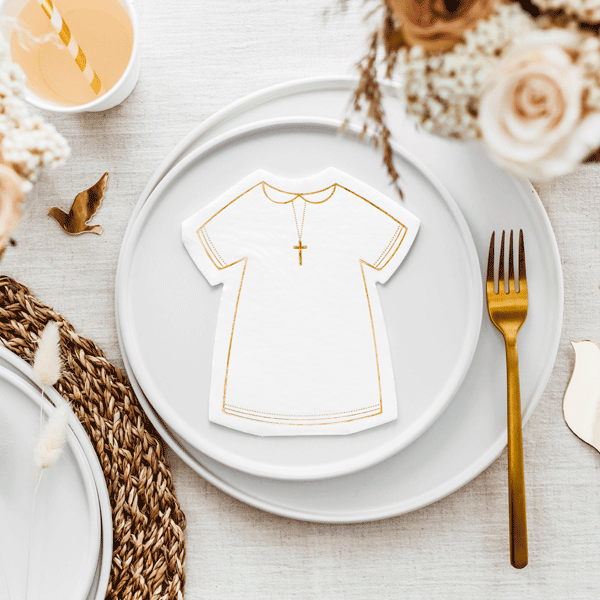 Preciosas servilletas de papel en color blanco en forma de vestido de comunión con detalles en dorado y una elegante cruz. Sencillas pero muy bonitas que le darán el toque perfecto a tu mesa de comunión