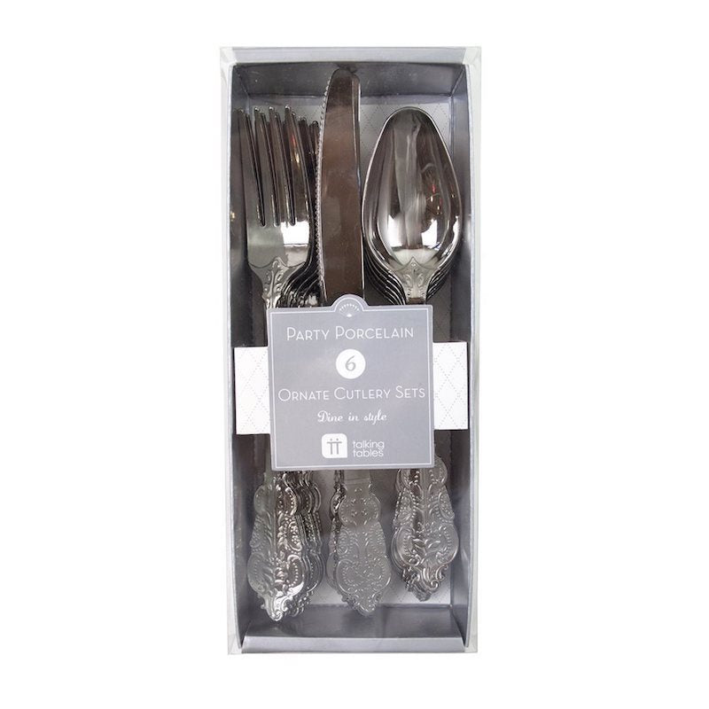 Dale un toque muy elegante a tus mesas de fiesta con estos cubiertos desechables con dibujos barrocos.
