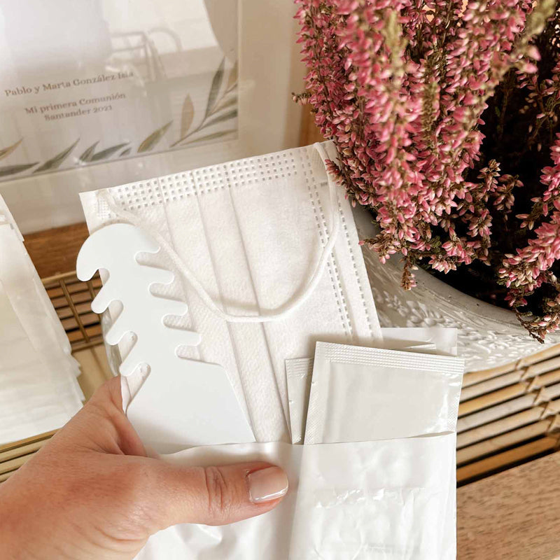 Puedes colocarlos en una mesita dentro de una caja a la entrada de la celebración para que cada invitado pueda coger su set seguro.
