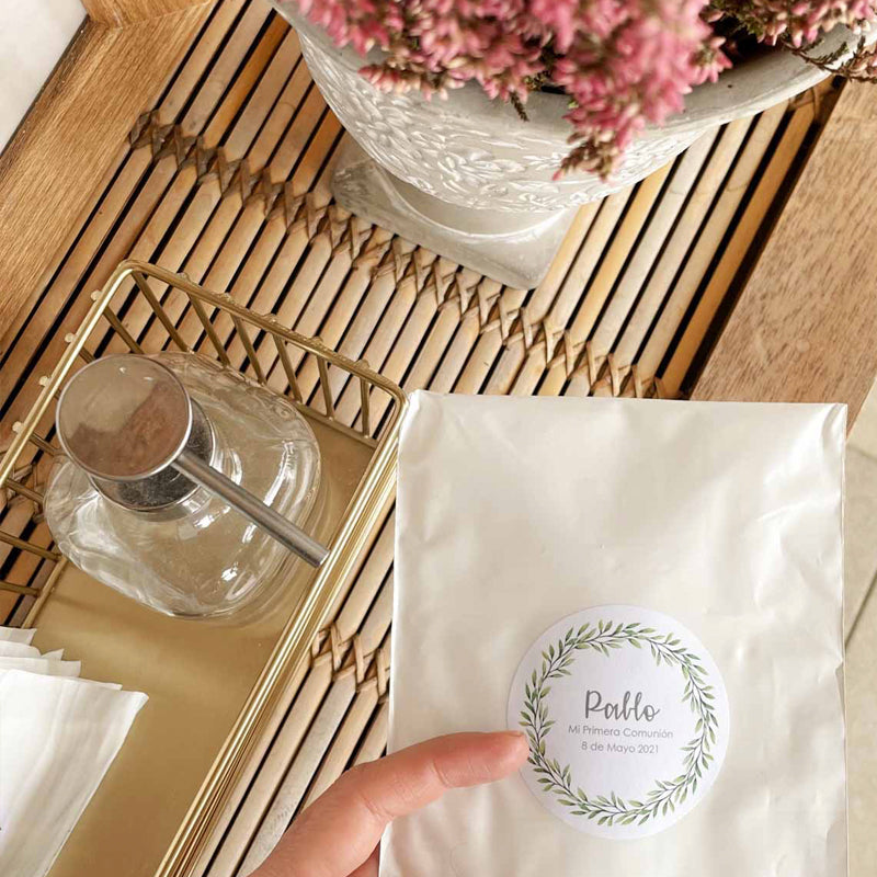 Crea un Rincón Seguro en tu celebración de Primera Comunión, Bautizo, Boda o Fiesta con este set higiénico. Encontrarás todo lo necesario para celebrar de una forma segura. Además van personalizados con una pegatina con el texto que nos especifiques.