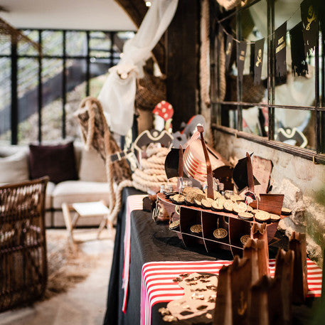 Sorprende a todos tus invitados con este espectacular stand con forma de barco pirata, ideal para poner mini pasteles, Cupcakes, golosinas. En este kit viene con todos los detalles de un verdadero barco pirata: 3 mástiles con vela de rayas rojas y calavera, un ancla y sus ventanas. Lo puedes limpiar con un paño húmedo, desarmarlo y volverlo a utilizar cuantas veces quieras. ¡Ah del barco!
